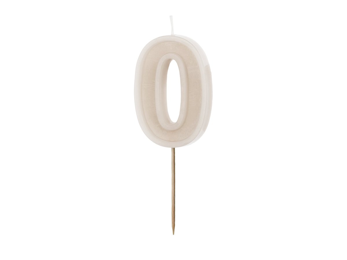 Verjaardagskaars Cijfer 0 in beige, Hoogte kaars ca. 6 cm, hoogte kaars met stok ca. 10 cm.