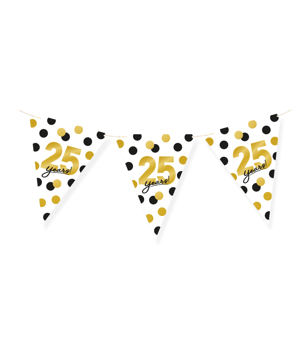 De Celebration! paper flags - 25 zijn de perfecte vlaggetjes om een feestje voor een 25-jarige op te leuken! Deze vlaggenlijn valt op door zijn onderscheidende design en omdat de vlaggetjes gemaakt zijn van papier denk je ook nog eens aan het milieu! De paper flags zijn 6 meter lang. Combineer ze met de bijpassende celebration! balloons!