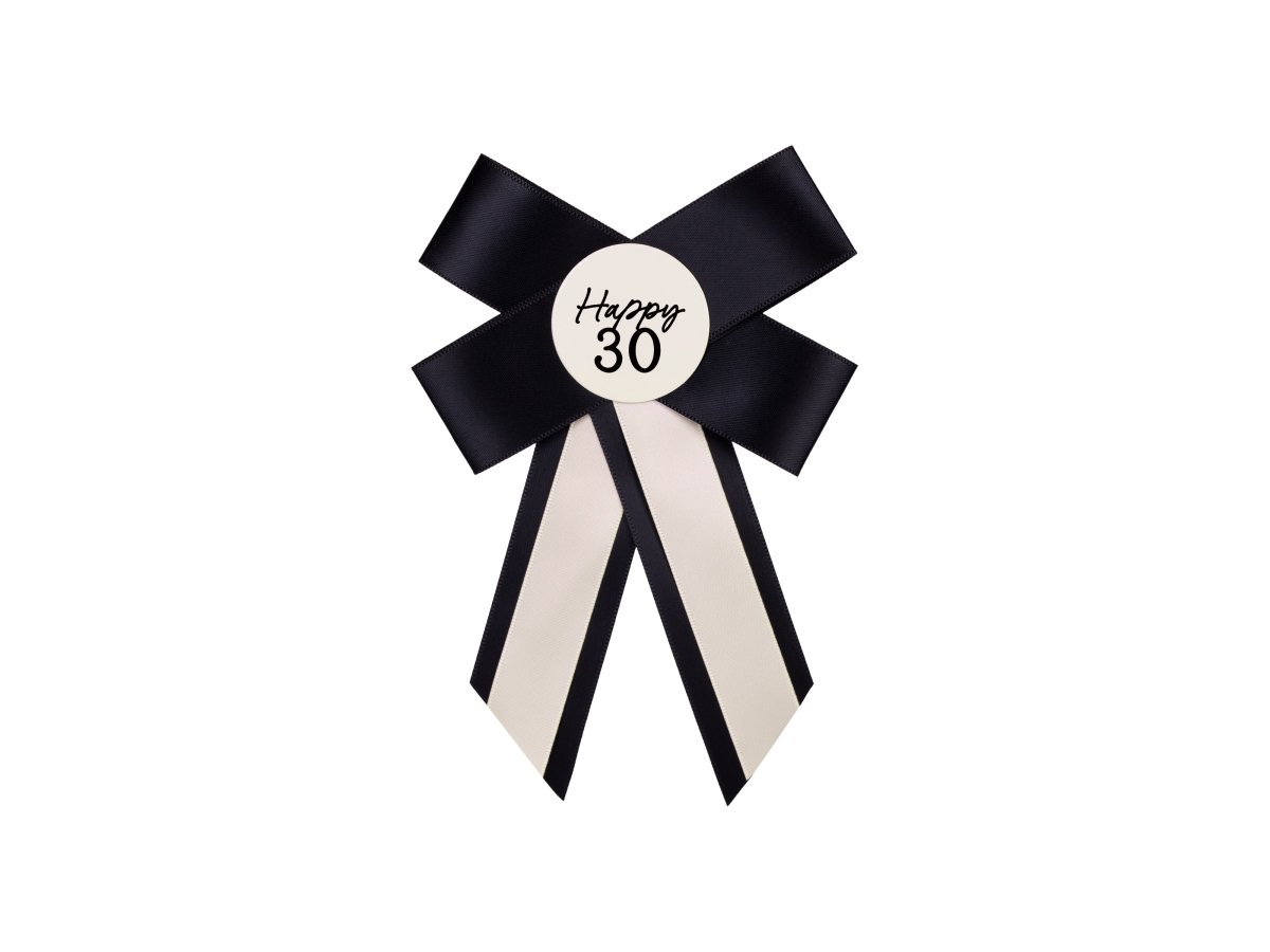Button voor 30e verjaardag in crème en zwart, afmetingen ongeveer 11 x 17 cm. De button wordt geleverd met een veiligheidsspeld.
