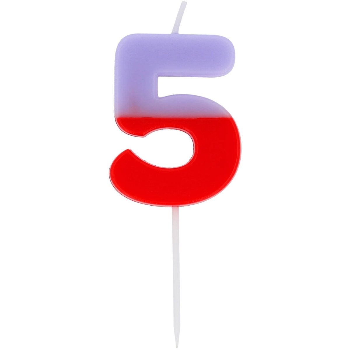 Als feest op de taart! Kaars - Stripetastic - Cijfer 5. Inhoud: 1 cijferkaars. Bijvoorbeeld te gebruiken tijdens de volgende feestgelegenheid/feestgelegenheden: Verjaardag, Kinderfeestje, Jubileum. Deze kaars heeft de vorm van het cijfer '5'. De bovenkant is lila en de onderkant is rood. Deze kaars is ongeveer 5 cm hoog en 8 mm dik. De totale lengte van de kaars (inclusief prikker, exclusief lontje) is ongeveer 9 cm. Dit artikel is gemaakt van wax.