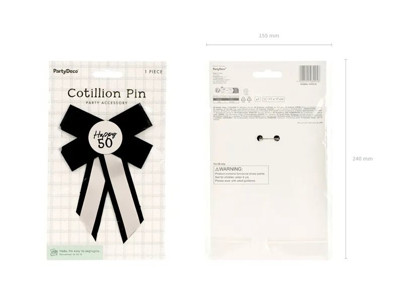Button voor 50ste verjaardag in crème en zwart, afmetingen ca. 11 x 17 cm. De button wordt geleverd met een veiligheidsspeld.