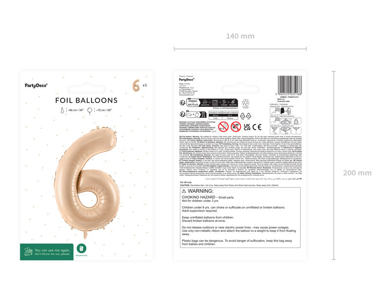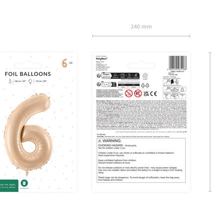 Pastelfolie ballon nummer “6” in beige kleur, afmeting voor opblazen ongeveer 86 cm (34''), afmeting na opblazen ongeveer 72 cm (28''). Voor het opblazen met lucht en helium. De set bevat een rietje.