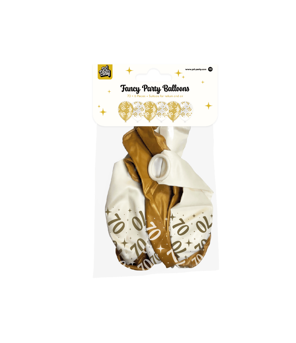 De Fancy Party Balloons - 70 van Paper Dreams zijn een stijlvolle toevoeging voor elk feest. Deze goud/witte ballonnen met opdruk "70" zijn gemaakt van hoogwaardig latex en hebben door hun luxe uitstraling een echte blikvangerstatus.