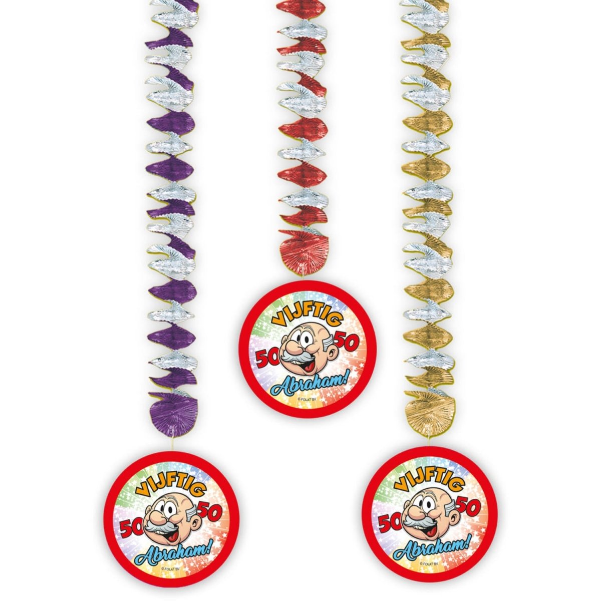 50 Jaar Abraham Regenboog Hangdecoratie - 3 stuks. Inhoud: 3 stuks hangdecoratie. Bijvoorbeeld te gebruiken tijdens de volgende feestgelegenheid/feestgelegenheden: Verjaardag, Abraham. Lengte van het artikel: 75 cm. Het artikel is gemaakt van papier.