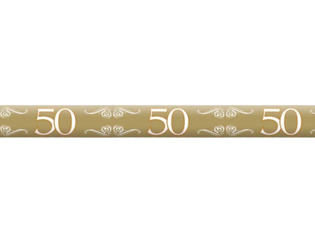 50 Jaar Jubileum Afzetlint - 15 meter. Inhoud: 1 markeerlint. Kleur: Goudkleurig. Bijvoorbeeld te gebruiken tijdens de volgende feestgelegenheid/feestgelegenheden: verjaardag. Dit afzetlint is 15 meter lang. Het artikel is gemaakt van plastic.