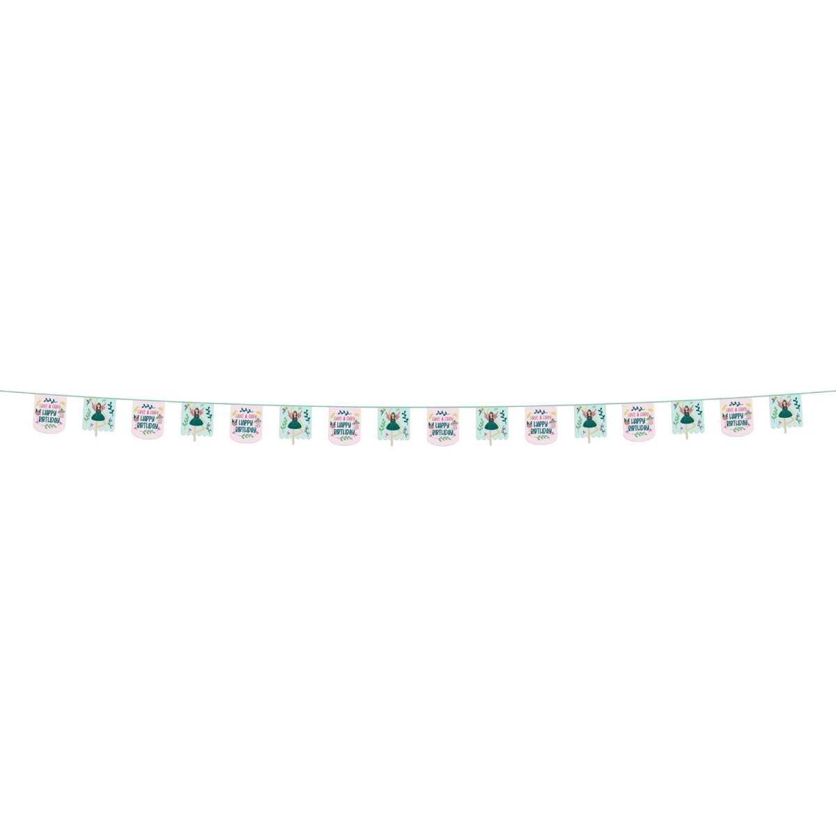 Het is feeën-feest! Vlaggenlijn - Fabulous Fairy - 6 meter. Inhoud: 1 vlaggenlijn. Bijvoorbeeld te gebruiken tijdens de volgende feestgelegenheid/feestgelegenheden: Kinderfeestje, Verjaardag. Er zitten 16 vlaggen van ongeveer 17 x 21 cm groot op deze 6 meter lange vlaggenlijn. Er zijn 3 soorten vlaggen: een licht turquoise vlag met schulprand met daarop een fee met oranje haar en groene blaadjes eromheen, eenzelfde vlag maar dan met een fee met bruin haar erop, en een zachtroze vlag met afgeronde hoeken en daarop de tekst "HAVE A FAIRY HAPPY BIRTH DAY" en eromheen feeën en groene blaadjes. De vlaggen zijn dubbelzijdig bedrukt. Deze vlaggenlijn hoort bij de Fabulous Fairy collectie van Folat. Dit artikel is gemaakt van papier.