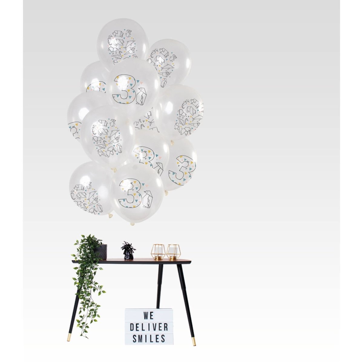 Ballonnen Origami 3 Jaar 30cm - 12 stuks. Inhoud: 12 latex ballonnen. Kleur: Transparant. Bijvoorbeeld te gebruiken tijdens de volgende feestgelegenheid/feestgelegenheden: Kinderfeestje. Elke ballon is 12 inch/30 cm. Het artikel is gemaakt van latex.