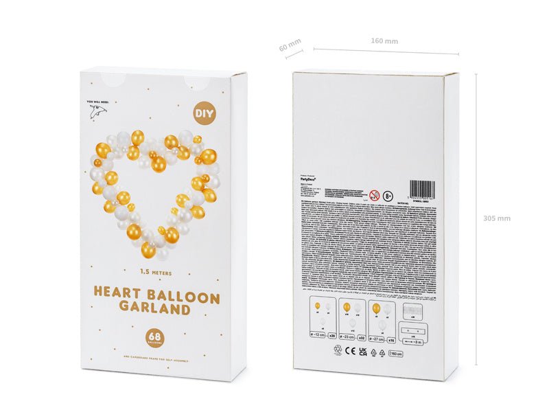 Witte en gouden ballonslinger met frame Hart, set bevat 68 ballonnen (22 stuks in Pastel Pure White kleur, 23 stuks in Metalic Pure White kleur, 23 stuks in Metallic Gold kleur), 16 kartonnen elementen, 20 stuks dubbelzijdige lijmstickers, instructie. Afmeting na vouwen ca. 166 x 160 cm.