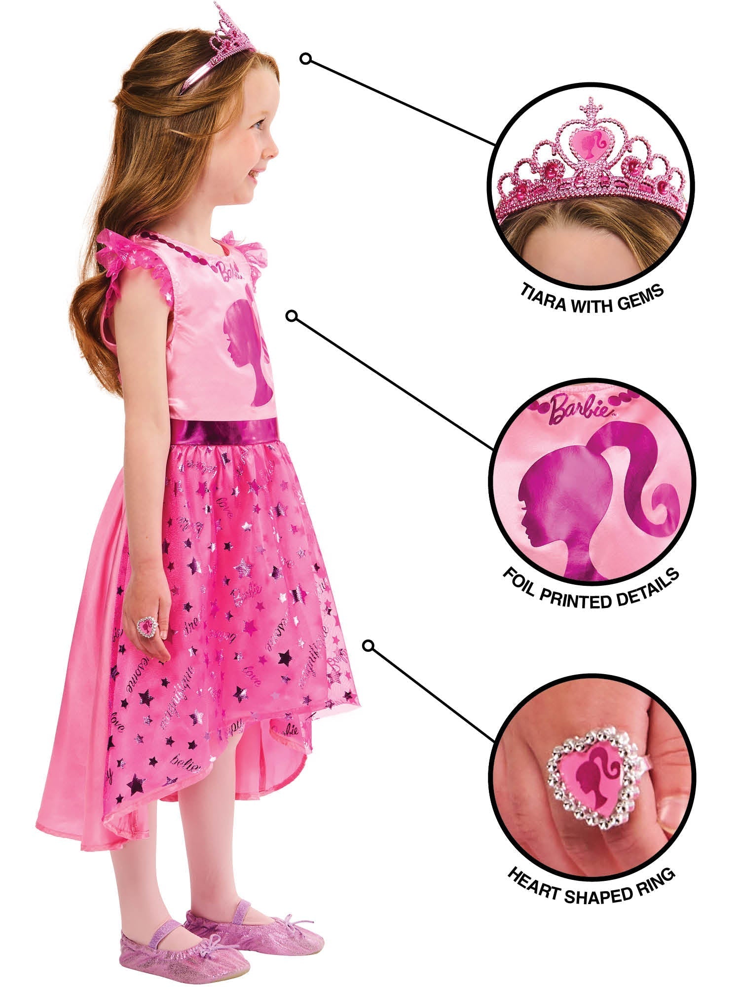 Laat je kind de wereld van mode en plezier ontdekken met deze Barbie verkleedset! De set bevat een jurk, haarband, armband en ring, zodat ze volledig in de huid van Barbie kunnen kruipen en hun eigen stijlvolle avonturen kunnen creëren. Perfect voor verkleedpartijtjes, rollenspel of fantasierijk spel.