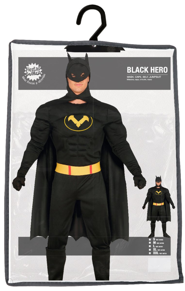 Inhoud: vleermuis jumpsuit, cape, riem en masker