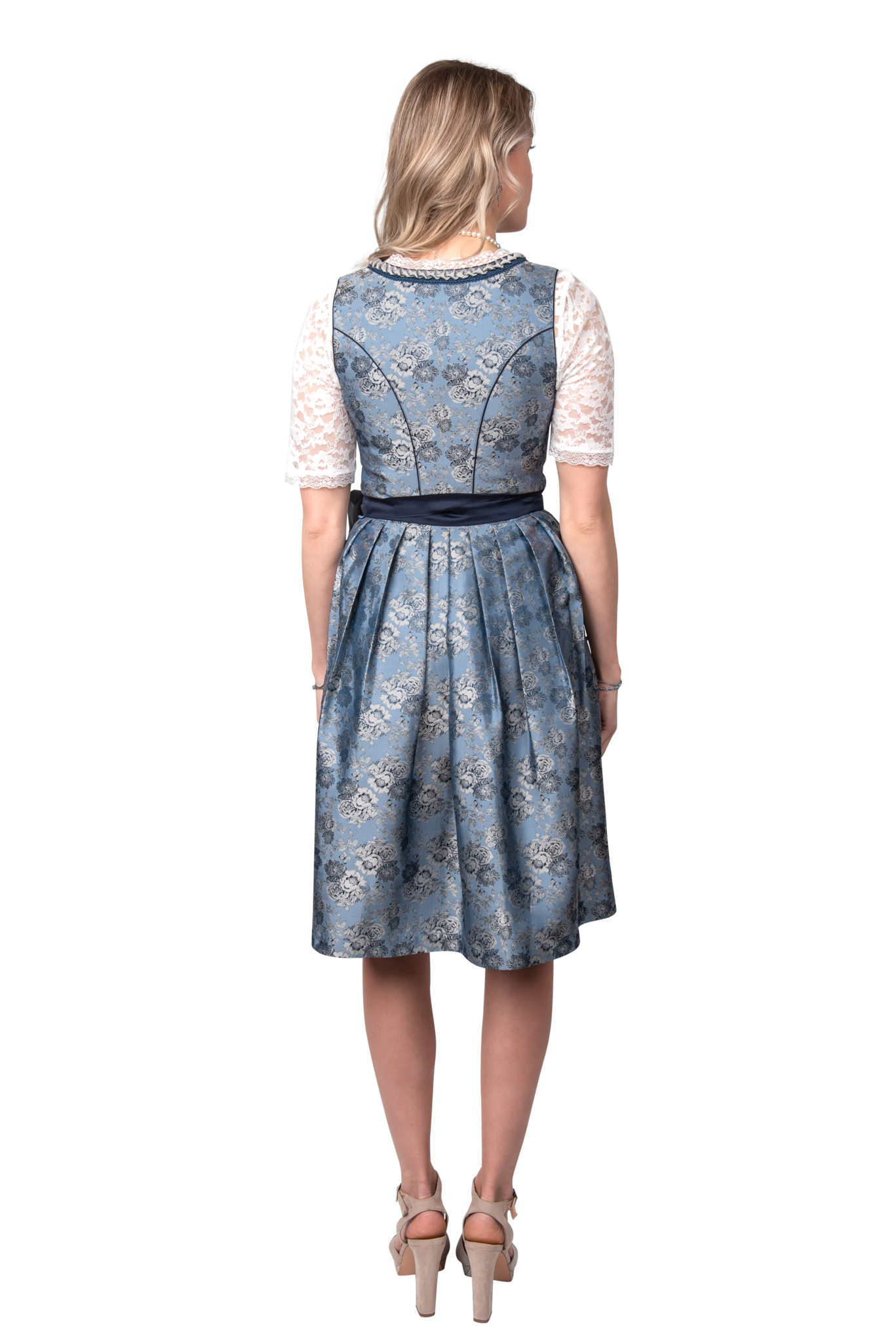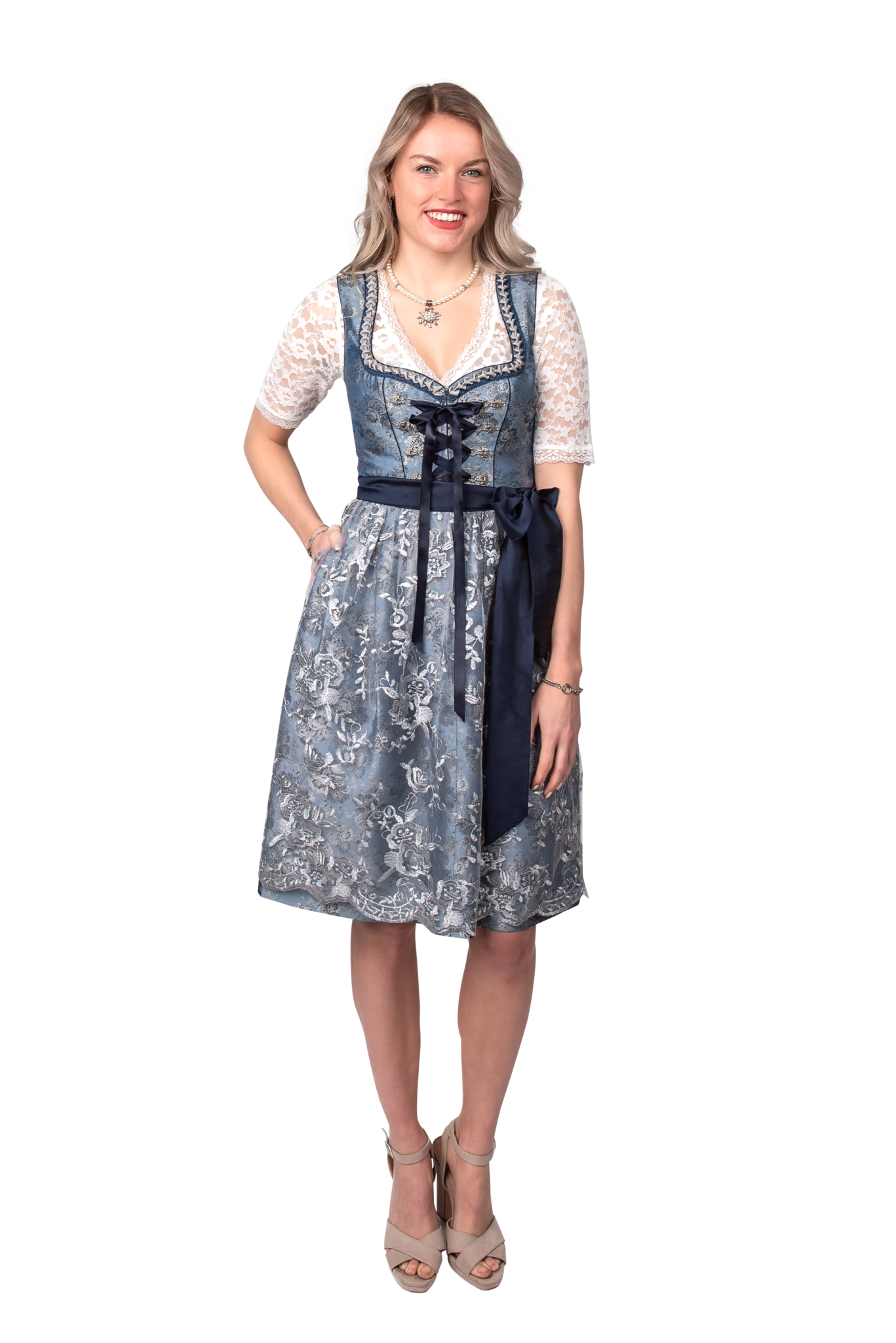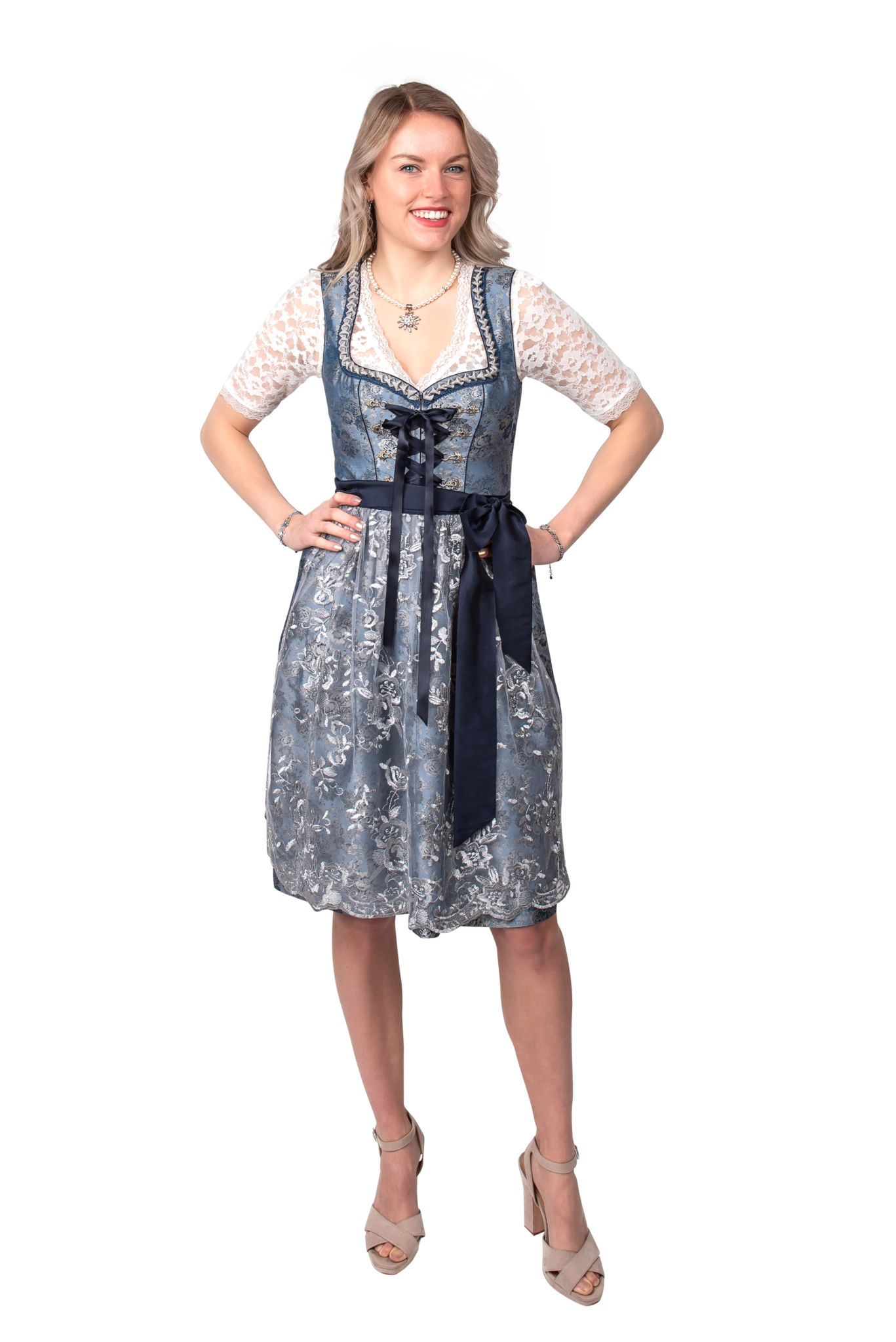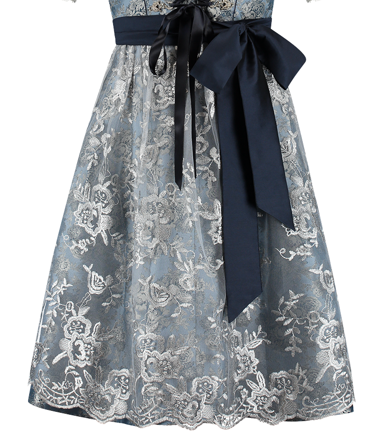 Stijlvolle dirndl 2 gemaakt van een fijne jacquardstof met een prachtig ingeweven patroon. Blauw/grijs bloemen motief, met stijlvolle schort van grijs kant en elegante schortdas van tafzijde.