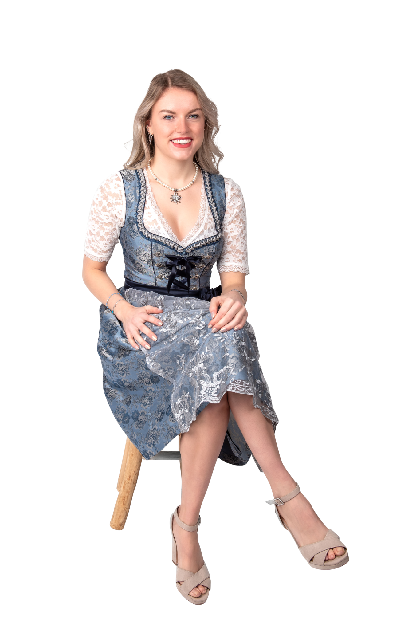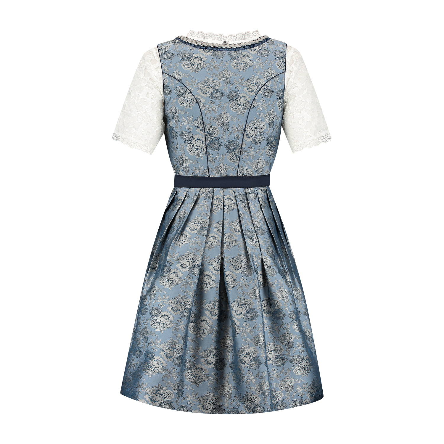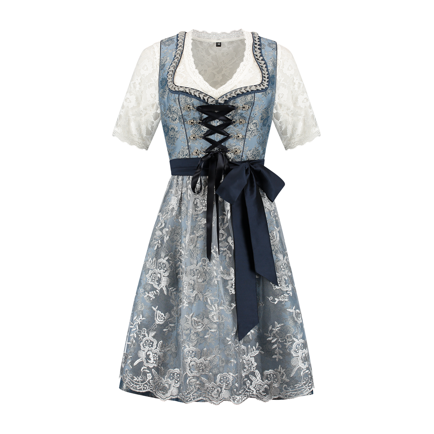 Stijlvolle dirndl 2 gemaakt van een fijne jacquardstof met een prachtig ingeweven patroon. Blauw/grijs bloemen motief, met stijlvolle schort van grijs kant en elegante schortdas van tafzijde.