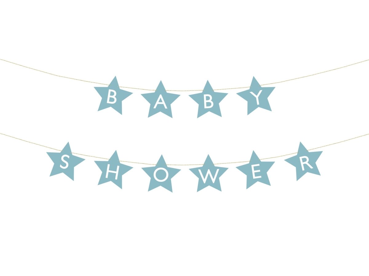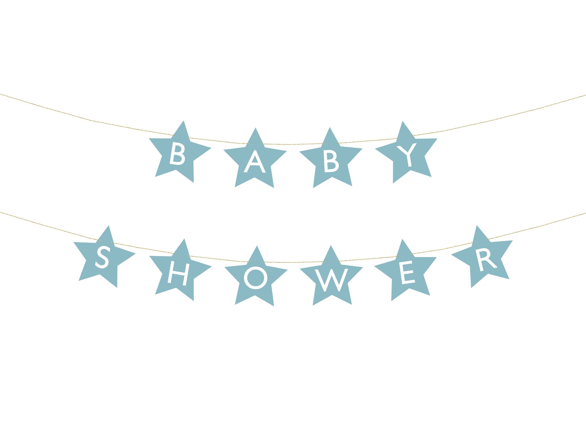Stervormige banner met het woord Baby Shower, gemaakt van lichtblauw papier, touwlengte ca. 3m.
