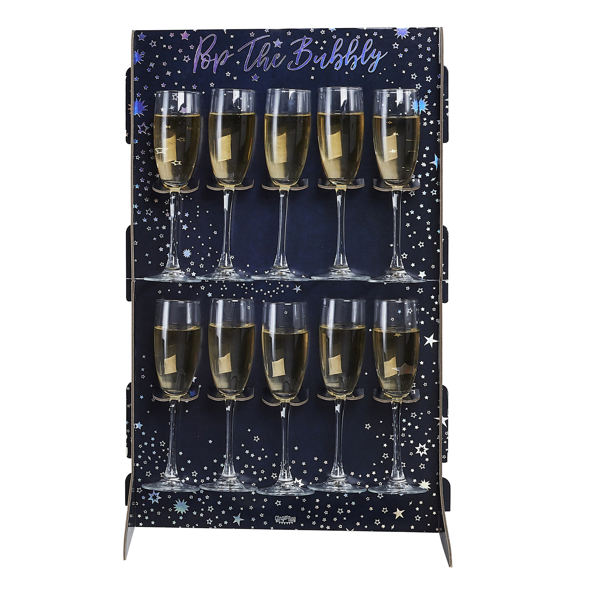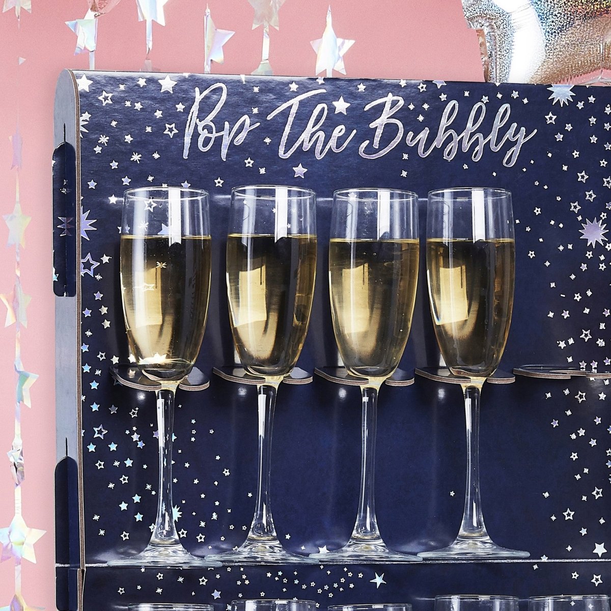 Plaats onze Prosecco-wand in het midden van uw tafel voor een display dat uw gasten nooit zullen vergeten. De drankmuur heeft een iriserende verijdelde Pop The Bubbly-tekst die de perfecte afwerking is voor een geweldige feestopstelling. Elke verpakking bevat 1 prosecco-wandstandaard met 2 standaards.