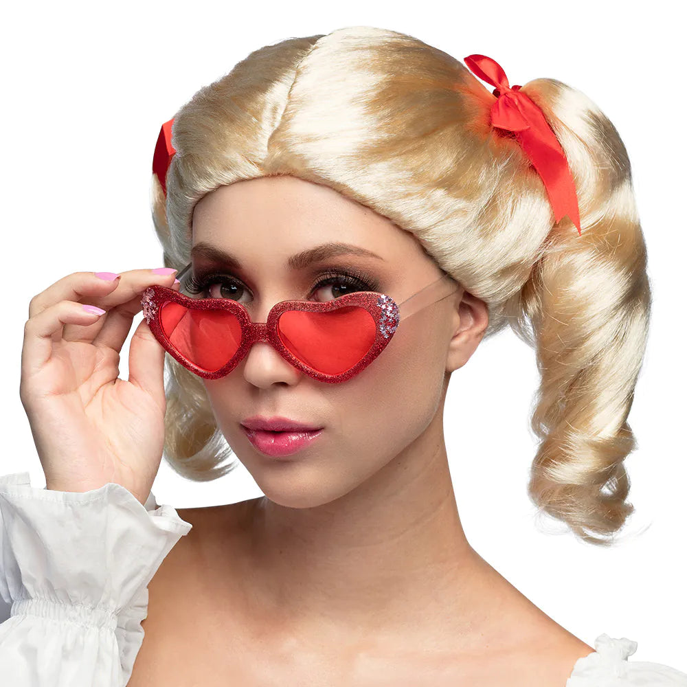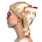 Straal tijdens carnaval of een themafeest als een echte jaren 50 babe met deze blonde pruik met staartjes. De toegevoegde rode lintjes voegen een speels accent toe. Deze pruik is ook de ultieme keuze wanneer je je outfit wat popperiger of meisjesachtiger wilt maken.