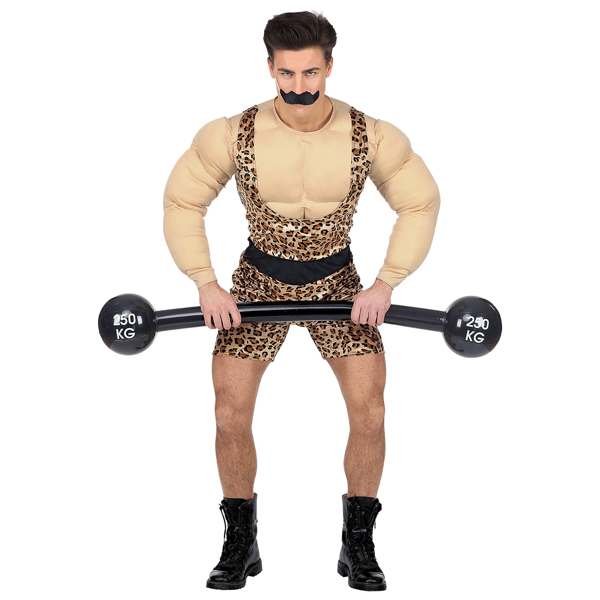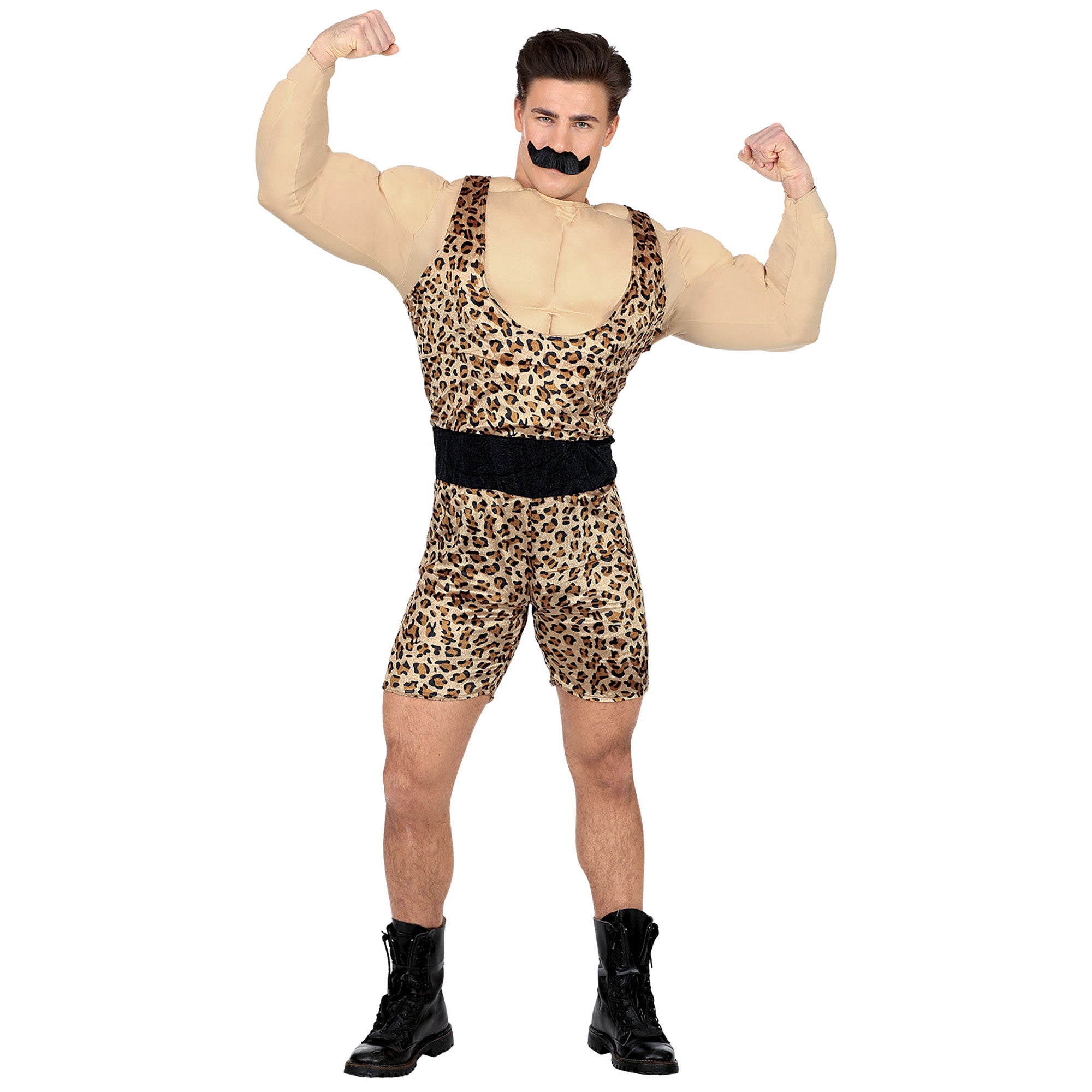 Omschrijving: sterke man overall met gespierd shirt en riem, snor