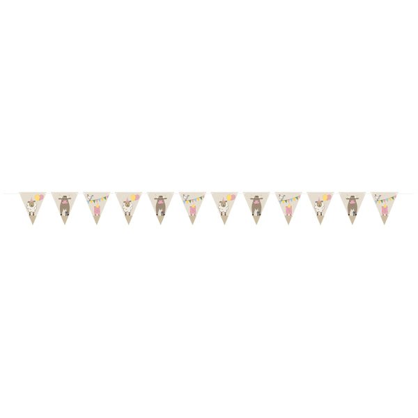 Deze kleurrijke banner is de perfecte hangdecoratie voor een feest met een boerenerf als thema. Op de driehoekige wimpels staan vrolijke boerderijdieren afgebeeld, zoals schapen en koeien die beslist klaar zijn voor een feest, met feestmutsen op en ballonnen in de hand!