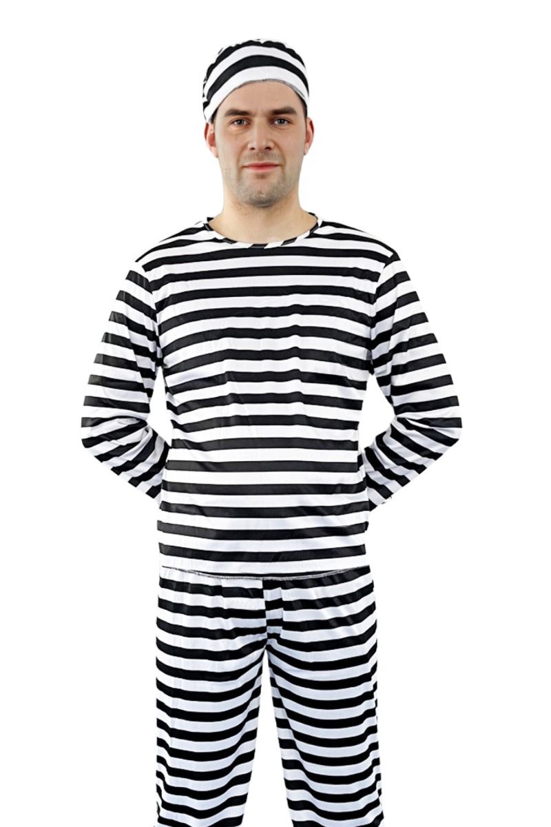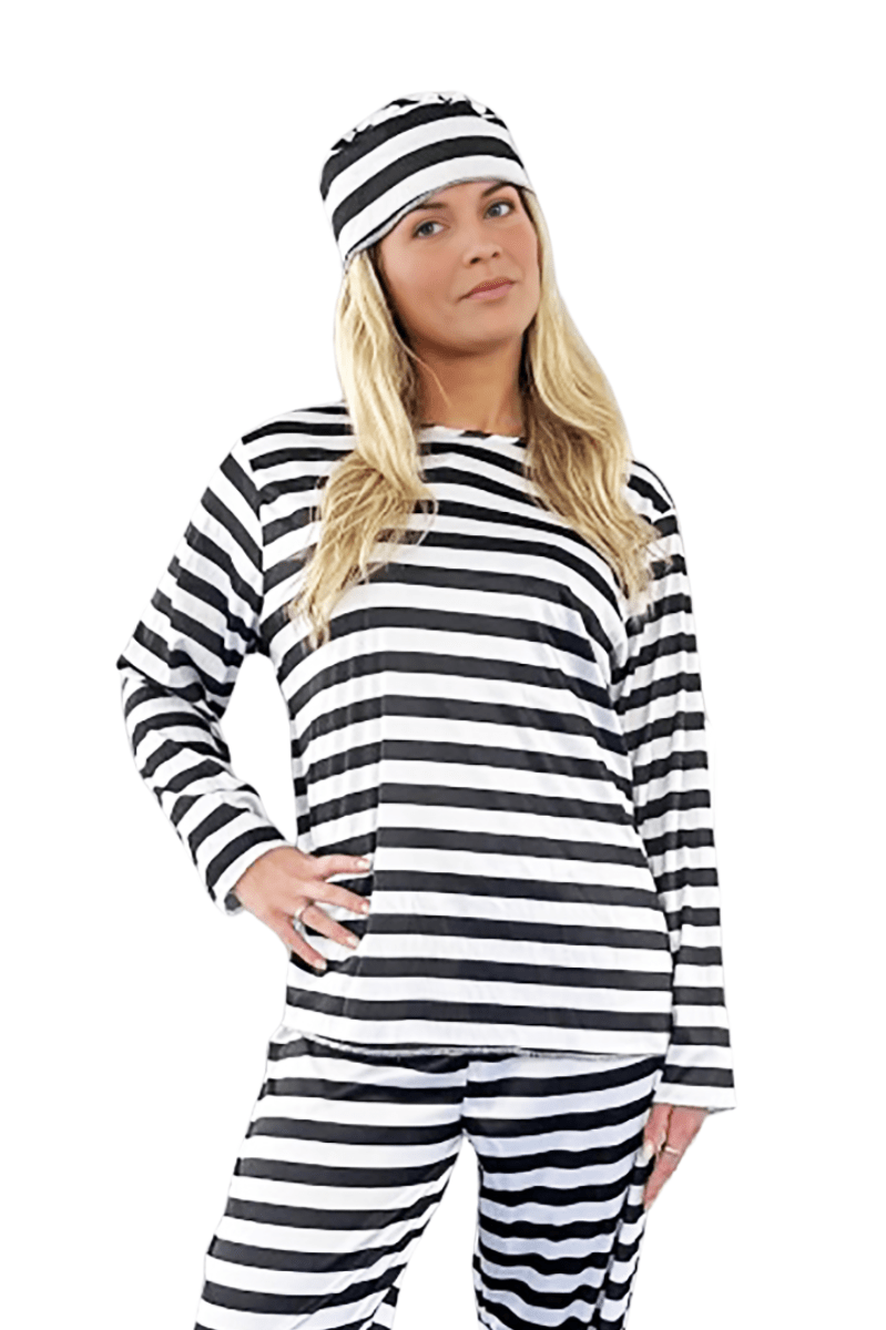 Dit zwart-witte gevangene kostuum is een klassieke en herkenbare outfit voor carnaval, themafeesten of verkleedpartijen.