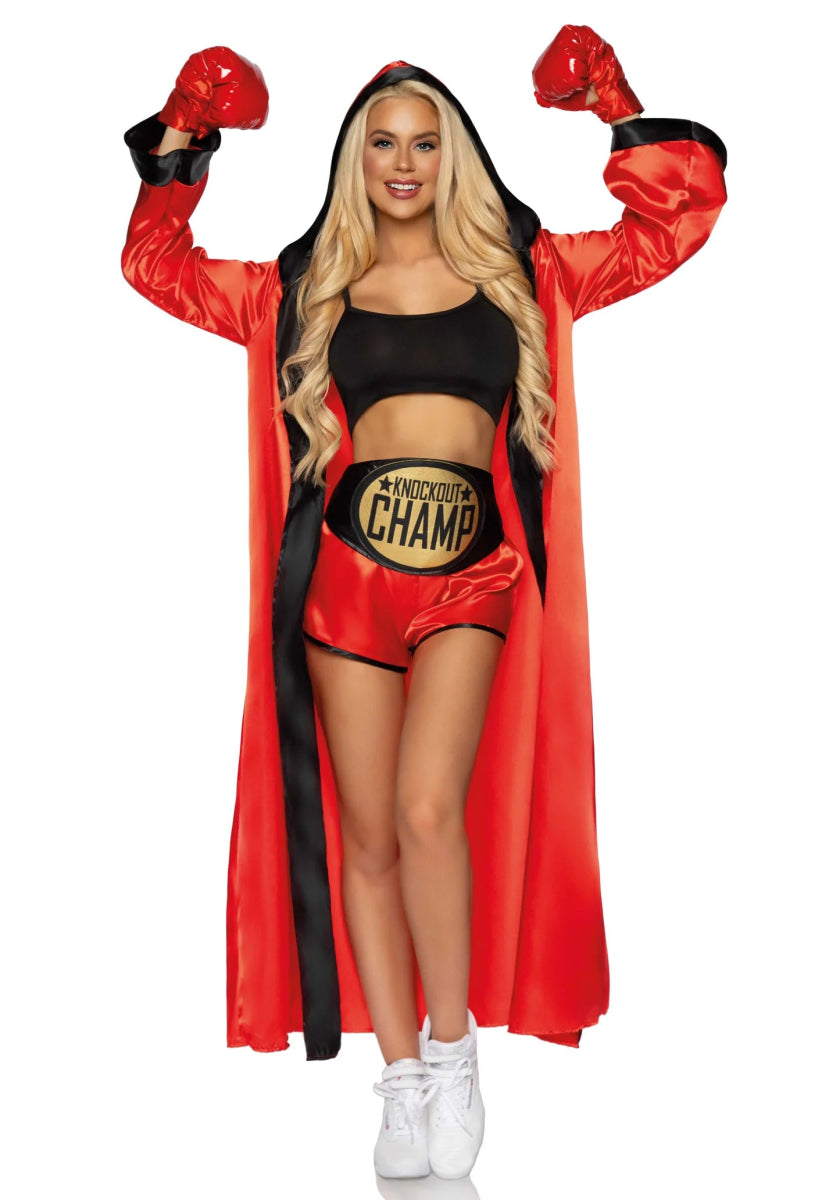Maak je klaar om de ring te betreden en de kampioenstitel te veroveren met het 5-delige Knockout Champ kostuum van Leg Avenue! Dit krachtige en stijlvolle ensemble bestaat uit een sportieve crop top, satijnen shorts met elastische tailleband, een losse satijnen boksersjas met capuchon, een kampioensriem en stoere vinyl bokshandschoenen. De perfecte outfit om te stralen op carnaval, Halloween of sportieve themafeesten! 🏆🔥
