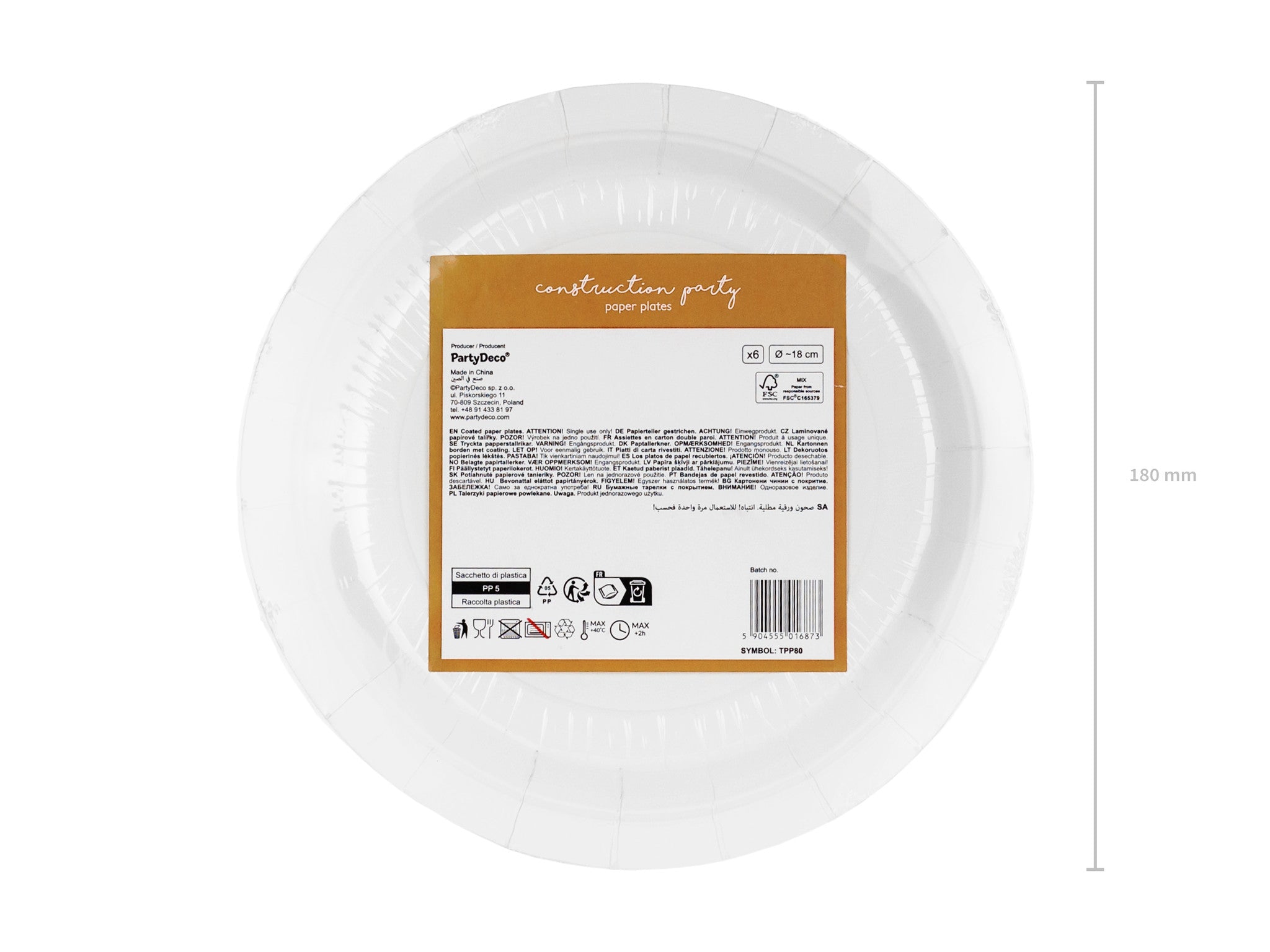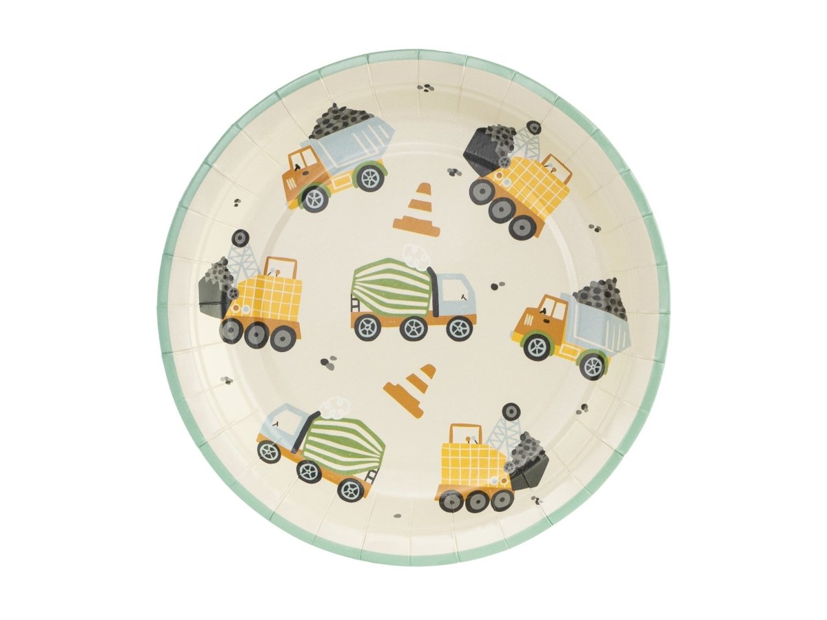 Papieren borden Bouwvoertuigen, diverse kleuren, afmeting ca. 18 x 18 cm.