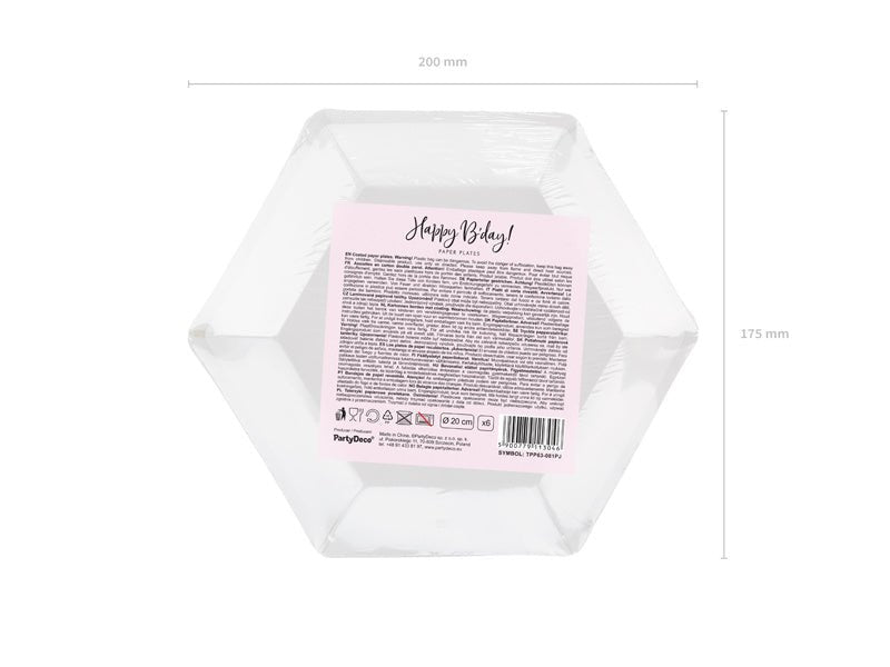 Papieren bordjes in licht poederroze kleur met iriserende inscriptie Happy B'day!, diameter ca. 20 cm.