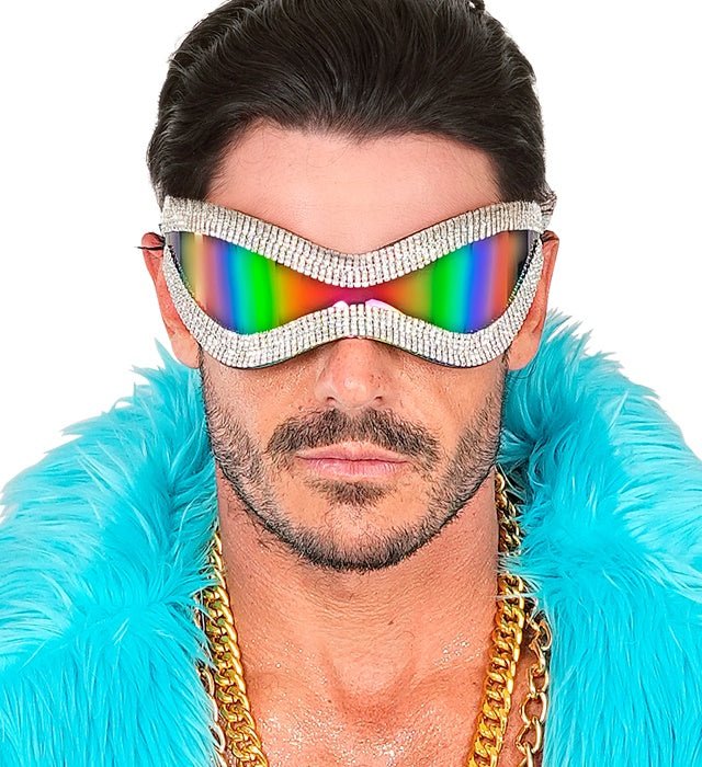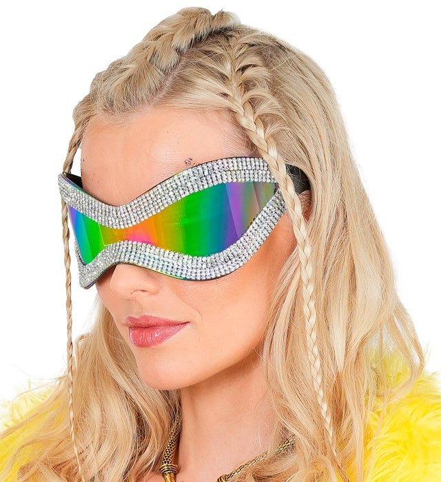 Maak een statement met deze opvallende oversized bril met strass steentjes en paars glas. Perfect om je outfit een glamoureuze en speelse uitstraling te geven.