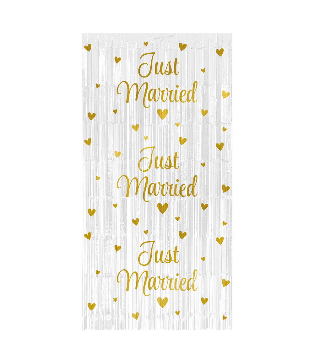 De party curtains just married van Paper Dreams zijn uitgevoerd in de stijlvolle kleuren goud en zilver. Deze feestelijke combinatie past perfect bij de andere feestversiering met just married thema. Naast party curtain - just married zijn deze unieke feestartikelen ook verkrijgbaar in andere kleuren en met leuke thema's. De afmeting van de gordijnen is 2 bij 1 meter.