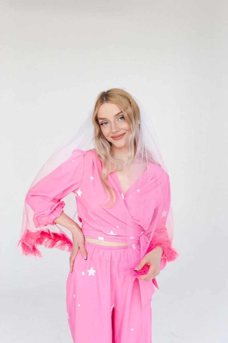 Bruiloft Sluier Wit Met Roze Kwastjes
