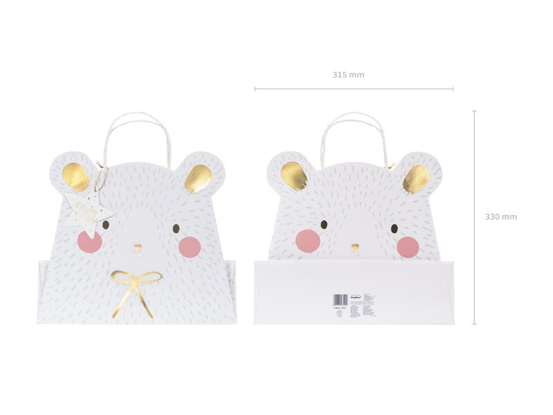 Geschenktas ijsbeer in witte kleur met kleurrijke en goudkleurige metallic print, afmeting zonder hengsels ca. 31,5 x 27 x 10 cm.
