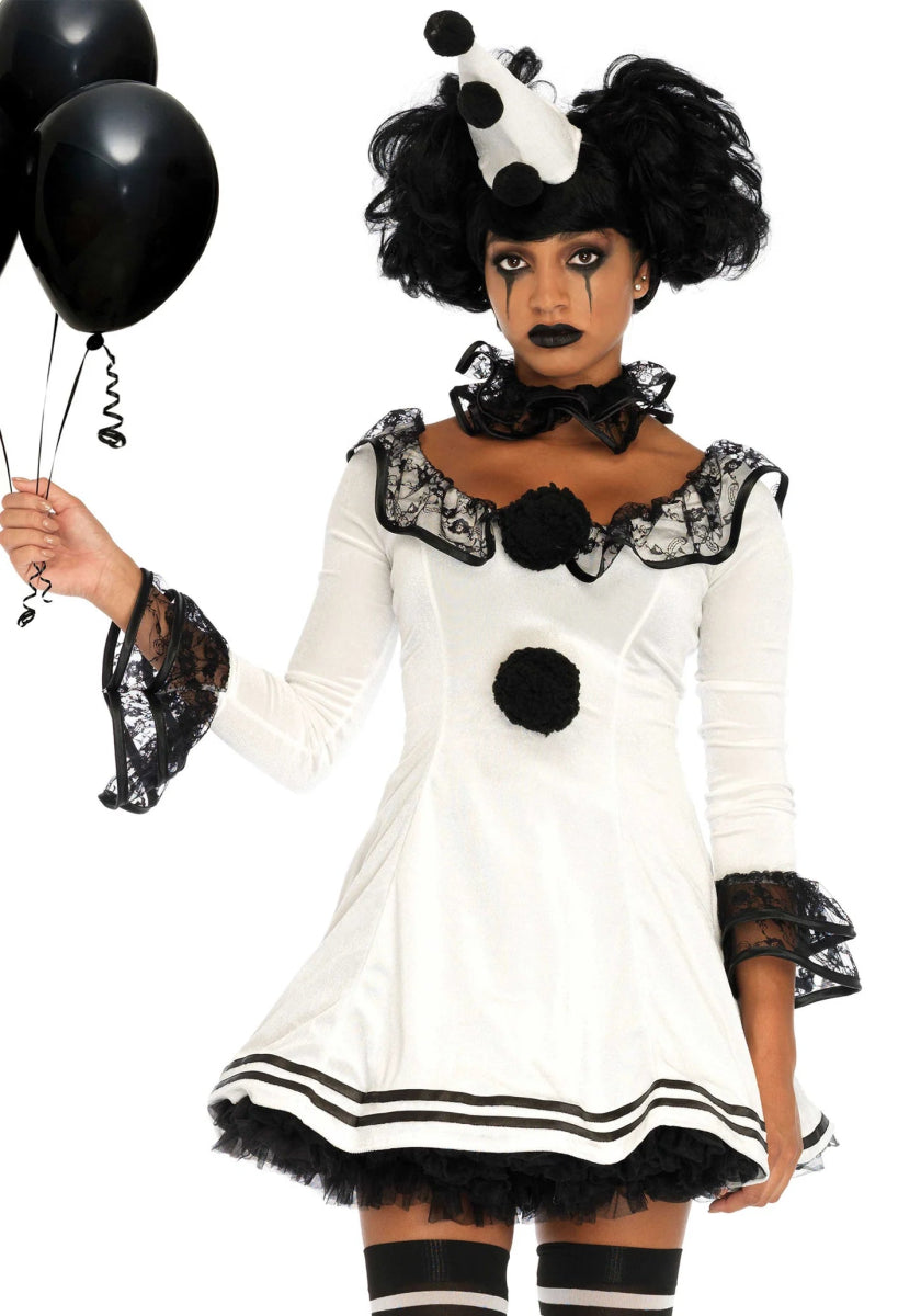 We houden van deze schattige Parijse Clown look! Het 3-delige Pierrot Clown Kostuum bevat een fluwelen jurk met kanten details en pomponaccenten, een ruches nekstuk en een bijpassende hoed op een haarband. Perfect om de show te stelen tijdens Halloween of een circusfeest! 🎉🤡