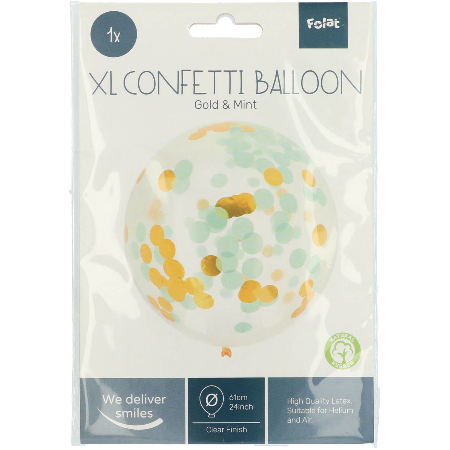 Ballon XL met Confetti Goud & Mint - 61 cm. Inhoud: 1 latex ballon. Kleur: Meerkleurig. Bijvoorbeeld te gebruiken tijdens de volgende feestgelegenheid/feestgelegenheden: Verjaardag en Kinderfeestje. De ballon is 24 inch/61 cm. De confetti is 3,2 cm groot en er zit 6 gram confetti in een ballon. Het artikel is gemaakt van latex. De confetti is gemaakt van folie en papier.
