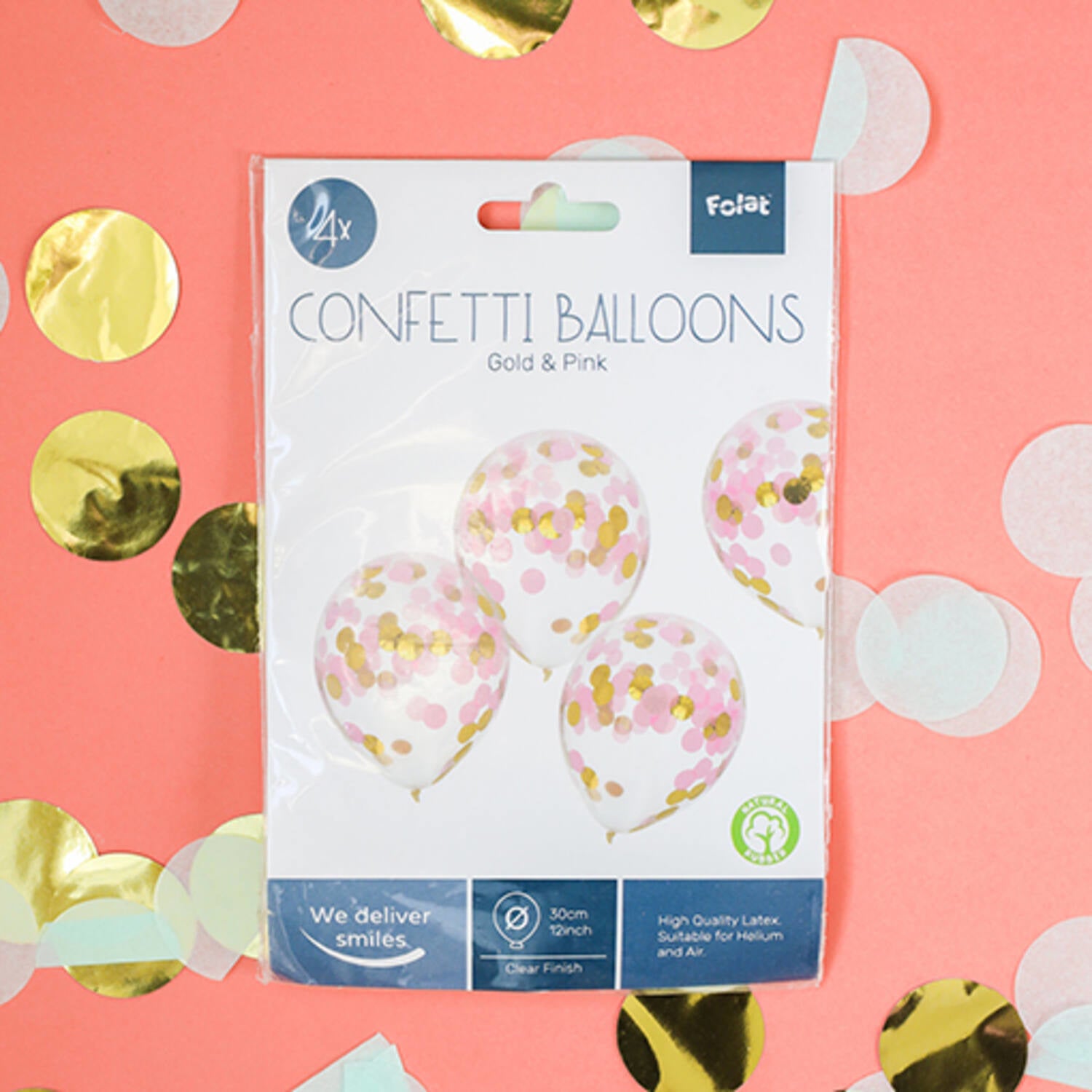 Ballonnen met Confetti Goud & Roze 30cm - 4 stuks. Inhoud: 4 latex ballonnen. Kleur: Meerkleurig. Bijvoorbeeld te gebruiken tijdens de volgende feestgelegenheid/feestgelegenheden: Verjaardag en Kinderfeestje. Elke ballon is 12 inch/30 cm. De confetti is 3,2 cm groot en er zit 2 gram confetti in een ballon. Het artikel is gemaakt van latex. De confetti is gemaakt van folie en papier.