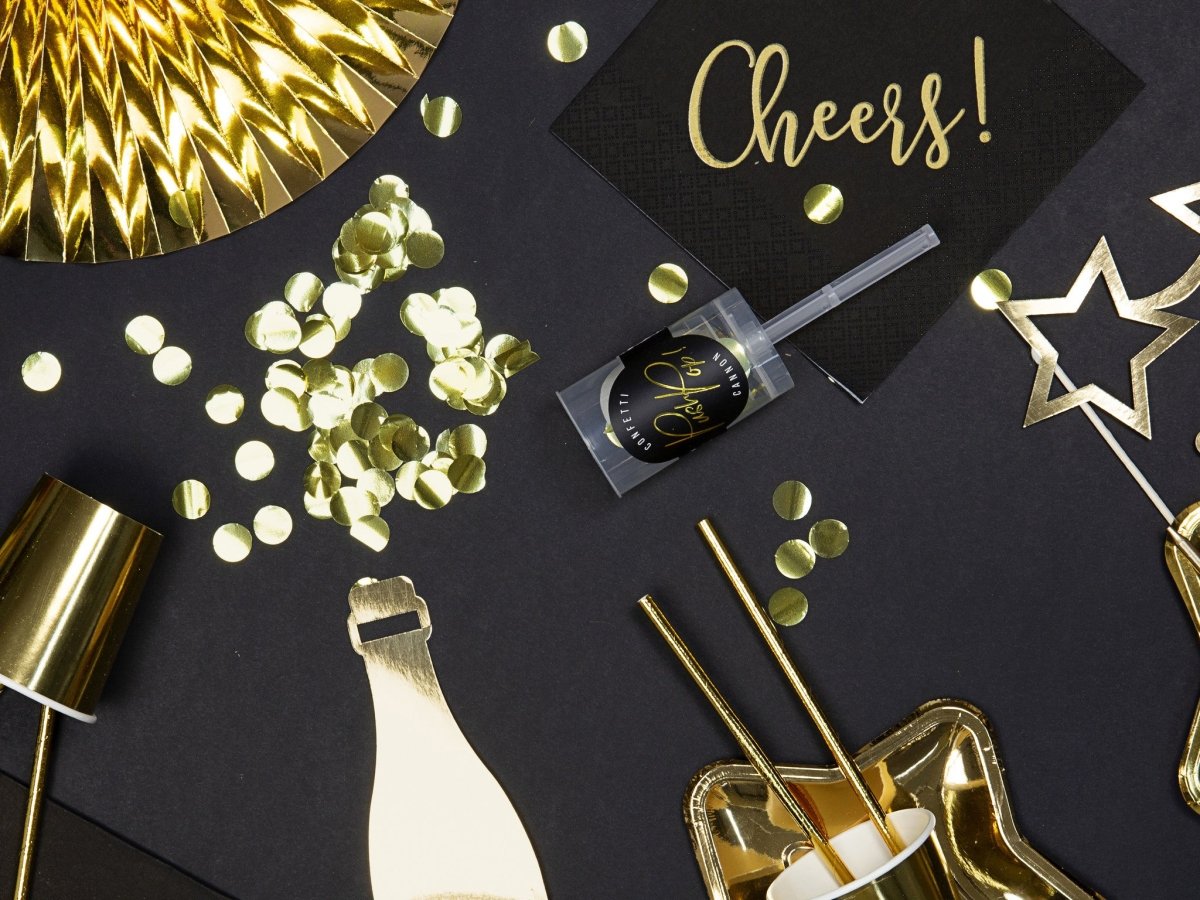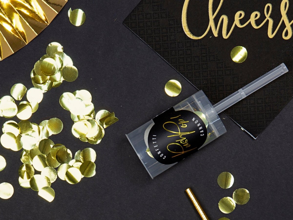 Inhoud: Confetti push pop, gemaakt van goud folie, diameter confetti ca. 15 mm.