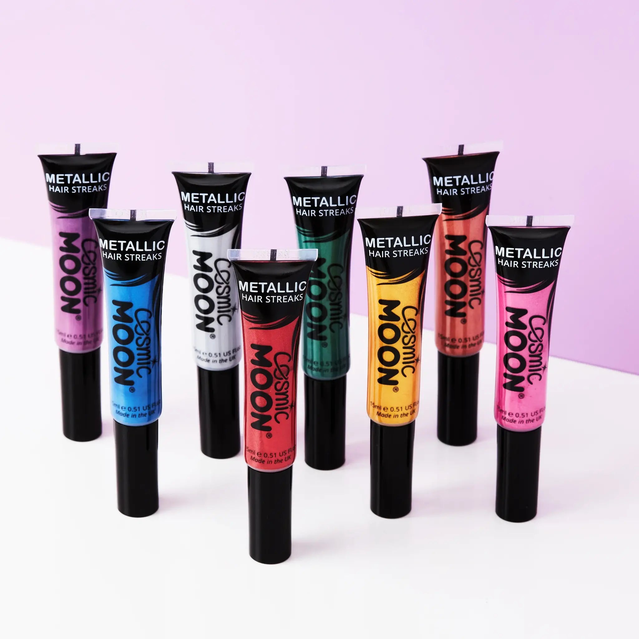 Verander je haarkleur onmiddellijk met een van deze 8 metallic kleuren van topkwaliteit. Gemakkelijk aan te brengen met een borstel en gemakkelijk te verwijderen met shampoo.
