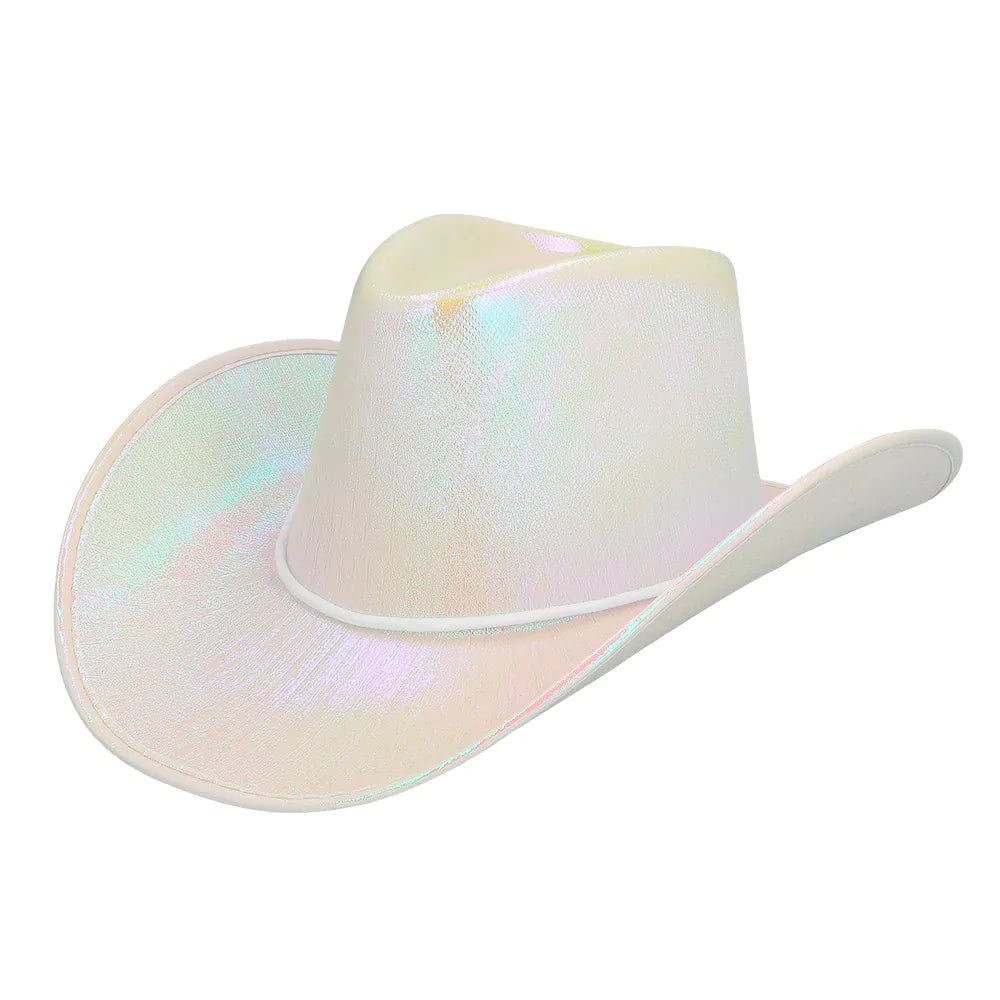 Laat de bride-to-be stralen op haar vrijgezellenfeest met deze trendy witte cowboyhoed met prachtige parelmoer glans. Deze western hoed is uiteraard ook het perfecte accessoire voor een wild west themafeest of foute party.