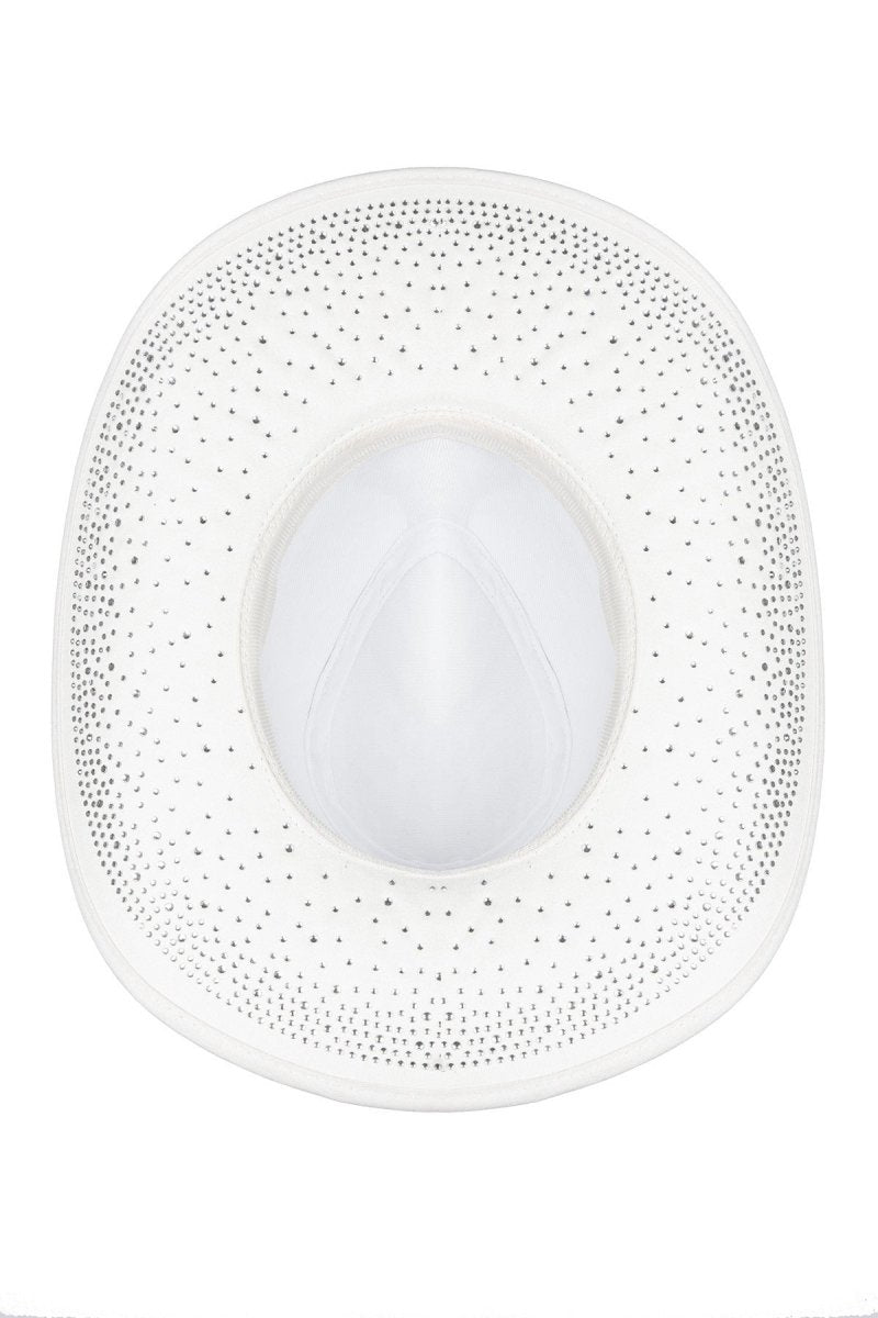 Opvallende witte cowboyhoed versierd met glinsterende zilveren strass-steentjes. Perfect als accessoire voor themafeesten, verkleedpartijen of festivals.