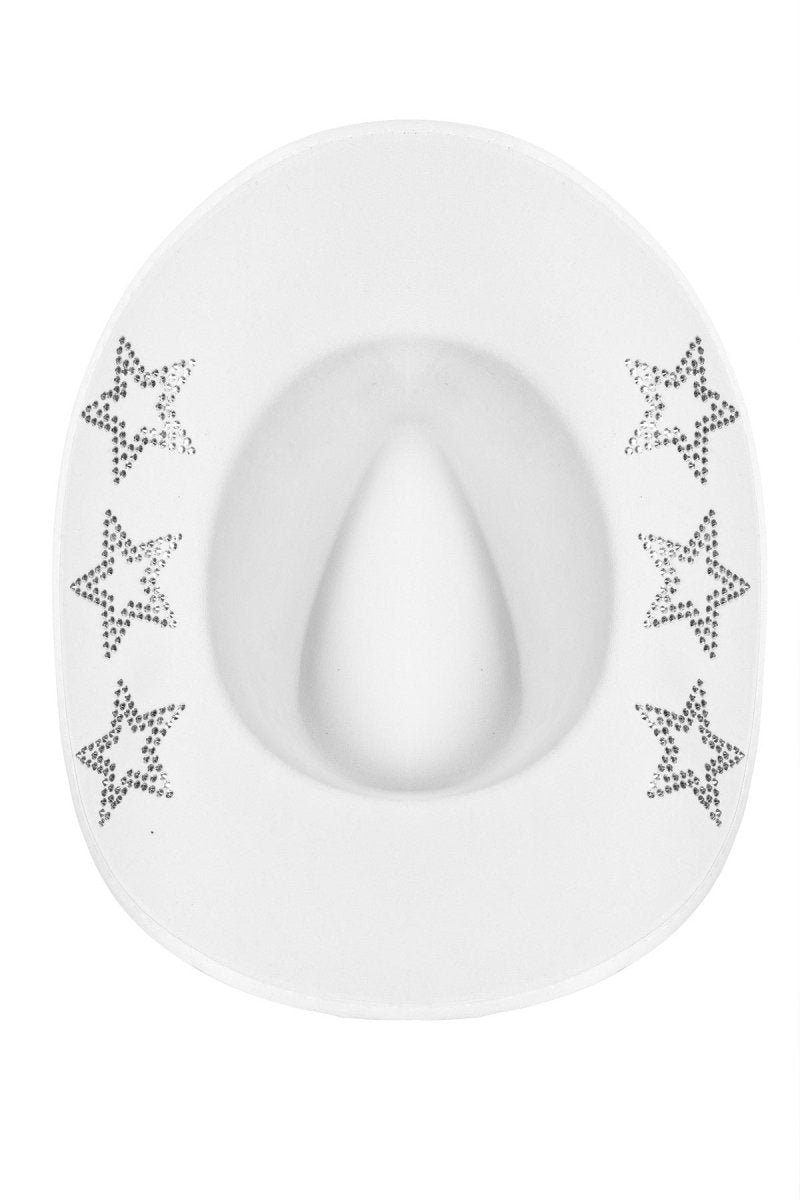 Opvallende witte cowboyhoed versierd met zilveren glittersterren. Perfect als accessoire voor themafeesten, verkleedpartijen of festivals.