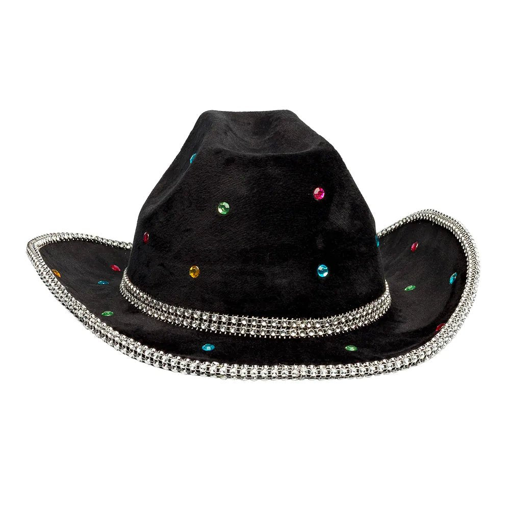 Deze zwarte cowboyhoed heeft een fluwelen look en is versierd met strass steentjes. De hoed is niet alleen heel leuk als toevoeging op een Western kostuum voor carnaval, het is ook te gek als finishing touch voor naar een hip festival. Door de glamoureuze en stoere uitstraling maakt het je outfit helemaal compleet!