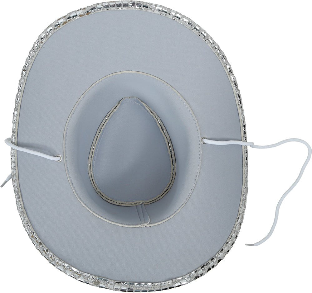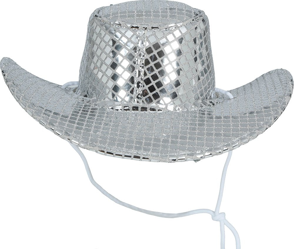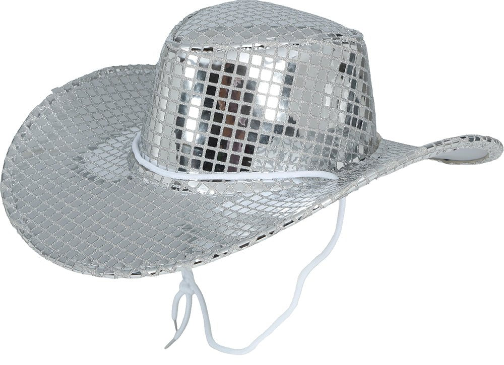 Maak een opvallende entree met deze zilverkleurige disco cowboy hoed. Het glanzende ontwerp geeft een feestelijke uitstraling en is perfect voor themafeesten, carnaval of verkleedpartijen.