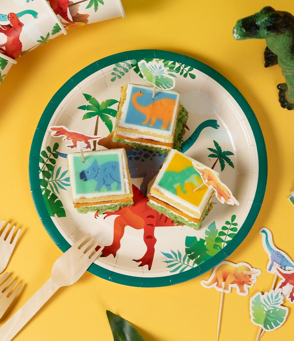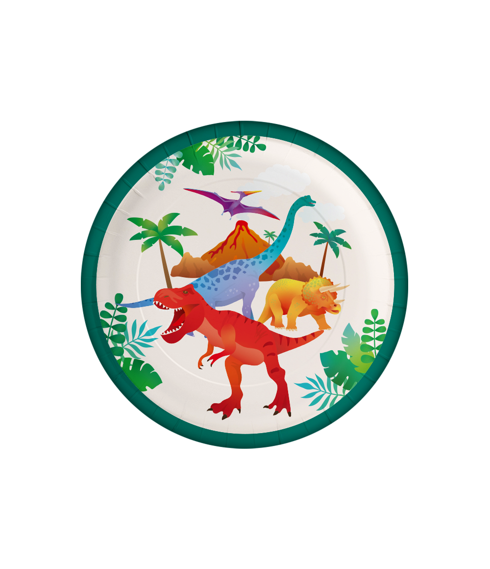 Breng je tafel tot leven met deze vrolijke dino-borden! Met hun kleurrijke design maken ze elk kinderfeestje extra feestelijk. De borden hebben een diameter van 23 cm en worden geleverd in een set van 8 stuks – ideaal voor traktaties, snacks en taart.