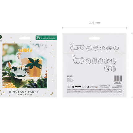 Dozen voor snacks Dinosaurussen van papier, mix van kleuren. Set bevat 4 grote en 2 kleine dozen en 6 papieren elementen. Afmetingen na montage van kleine doosjes ca. 10 x 10 x 5,5 cm, grote doosjes ca. 9,5 x 9,5 x 12 cm. Doe het zelf product. (1 pkt / 6 stuks)