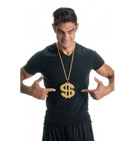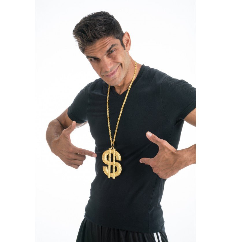 Maak je hiphop- of gangsta-look compleet met deze opvallende 100 cm lange ketting, voorzien van een groot dollar-teken van 11 x 10 cm in metaal, perfect voor themafeesten, verkleedpartijen of festivals.