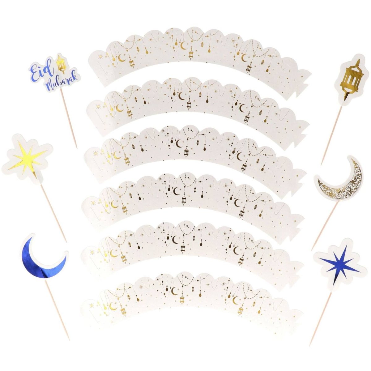 Zo smaakt het allemaal nog lekkerder. Cupcake Decoratie Set, Eid Mubarak, 12 stuks. Inhoud: 12 taart decoraties. Bijvoorbeeld te gebruiken tijdens de volgende feestgelegenheid/feestgelegenheden: Eid Mubarak, Themafeest. Deze Cupcake Decoratie Set bestaat uit 6 cupcake wikkels en 6 feestelijke prikkers: een blauwe maan, een gouden maan, een blauwe ster, een gouden ster, een gouden olielamp en eentje met de tekst "Eid Mubarak'. De wikkels en de figuren op de prikkers zijn gemaakt van eenzijdig bedrukt (hot stamping) papier, de prikkers zelf zijn van hout en zijn 8,5 cm lang. Dit artikel is gemaakt van papier en hout.