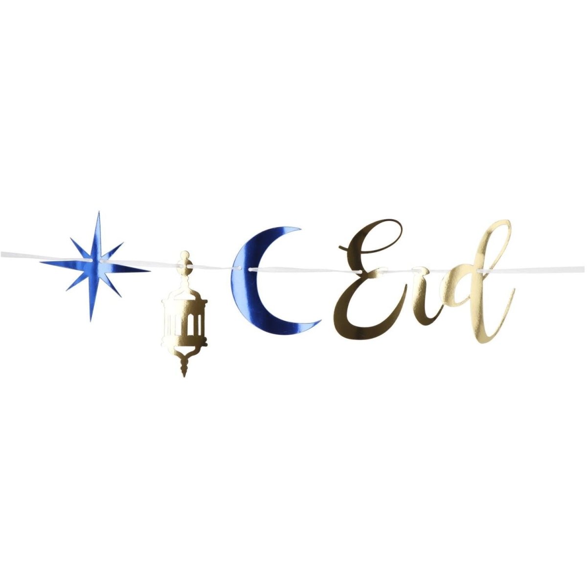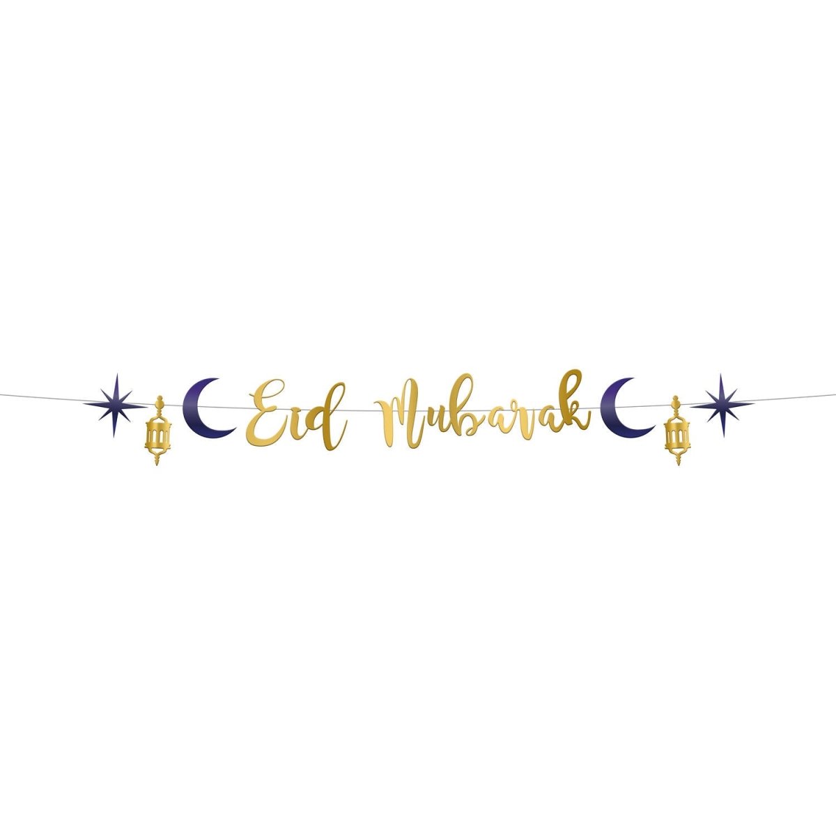 Wens elkaar een Gezegend Feest. Letterslinger 'Eid Mubarak', 1,5 meter. Inhoud: 1 letterslinger. Bijvoorbeeld te gebruiken tijdens de volgende feestgelegenheid/feestgelegenheden: Eid Mubarak. Een letterslinger met de wens 'Eid Mubarak' omringd door een maan, een olielampje en een ster. De letters en figuren zijn van papier en eenzijdig met folie gelamineerd. De slinger is van plastic. Dit artikel is gemaakt van papier en plastic.