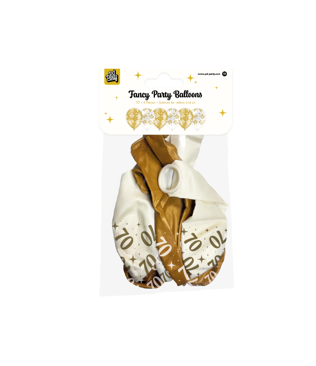 De Fancy Party Balloons - 70 van Paper Dreams zijn een stijlvolle toevoeging voor elk feest. Deze goud/witte ballonnen met opdruk "70" zijn gemaakt van hoogwaardig latex en hebben door hun luxe uitstraling een echte blikvangerstatus.