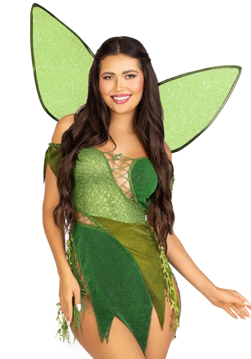 Stap in de schijnwerpers en laat je innerlijke tovenares stralen in het Bosfee kostuum van Leg Avenue! Dit betoverende 3-delige ensemble bestaat uit een prachtige patchwork jurk met verstelbare veters en een rok versierd met bladaccenten. De afneembare transparante bandjes en glinsterende feeënvleugels voegen een extra vleugje magie en veelzijdigheid toe. Perfect voor Halloween, carnaval of een themafeest waar je je betoverende bosfee-look wilt laten schitteren! 🌿🦋