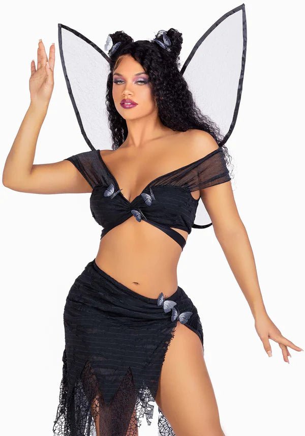 Betover iedereen om je heen in de 4-delige Duistere Feeënset van Leg Avenue! Deze set bestaat uit een crop top met vlinderaccenten, een asymmetrische rok met net-overlay, vlinderclips en glinsterende vleugels. Perfect voor Halloween, een cosplay-evenement of een themafeest, deze outfit laat je zowel magisch als gedurfd stralen! ✨💫