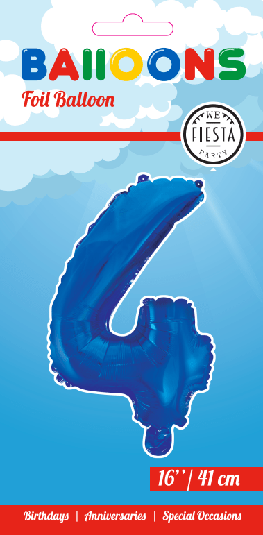 Folie Ballon Cijfer 4 Blauw 41cm met Rietje