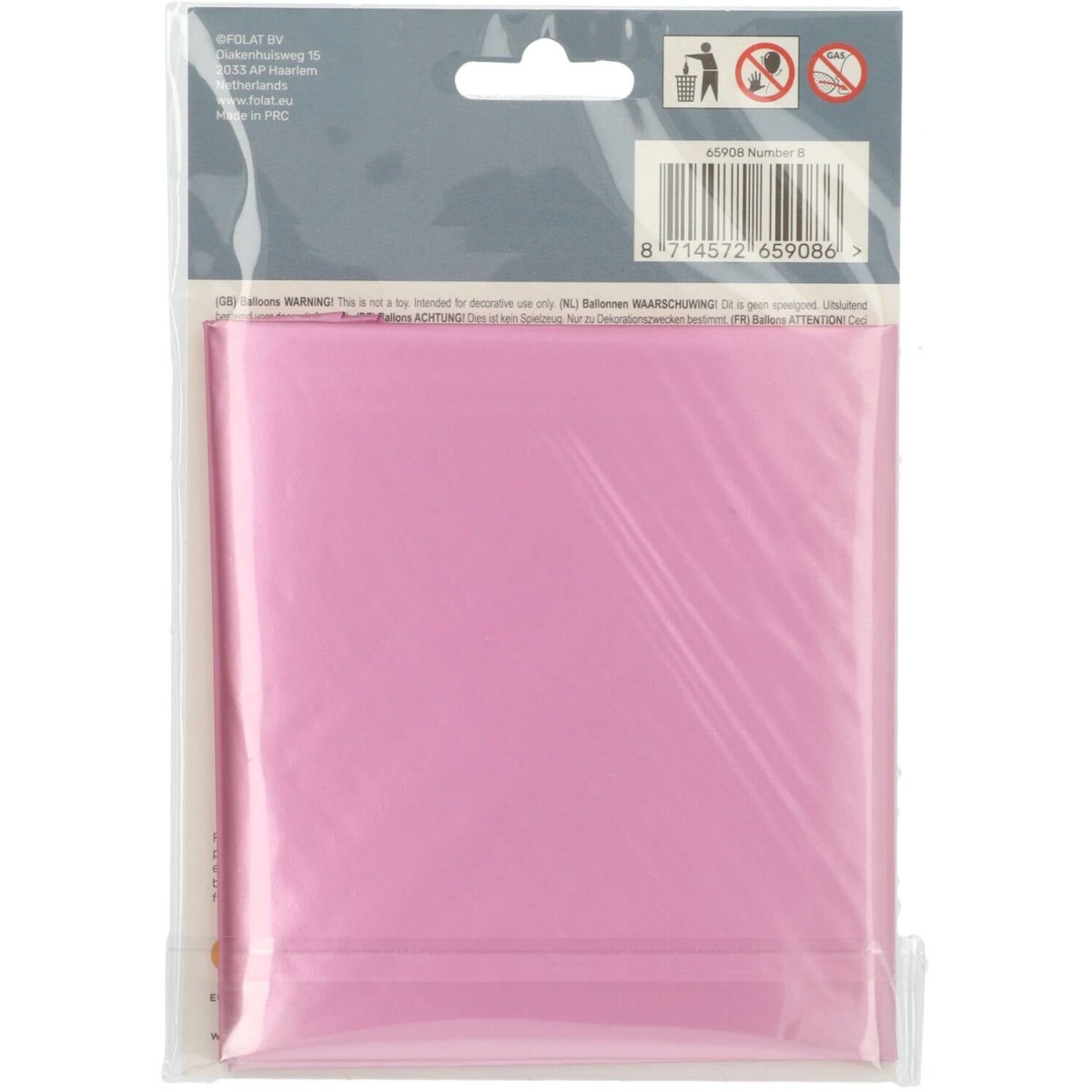 Mooie grote folieballon van het cijfer 8 in een metallic mat roze kleur. Inhoud: 1 folieballon van 86cm. Kleur: Roze. De ballon komt met handige ophang tabs, zodat hij makkelijk opgehangen kan worden. Bijvoorbeeld te gebruiken tijdens de volgende feestgelegenheid/feestgelegenheden: Verjaardag, Kinderfeestje en Jubileum. Deze folieballon is 34 inch/86 cm. Het artikel is gemaakt van folie.