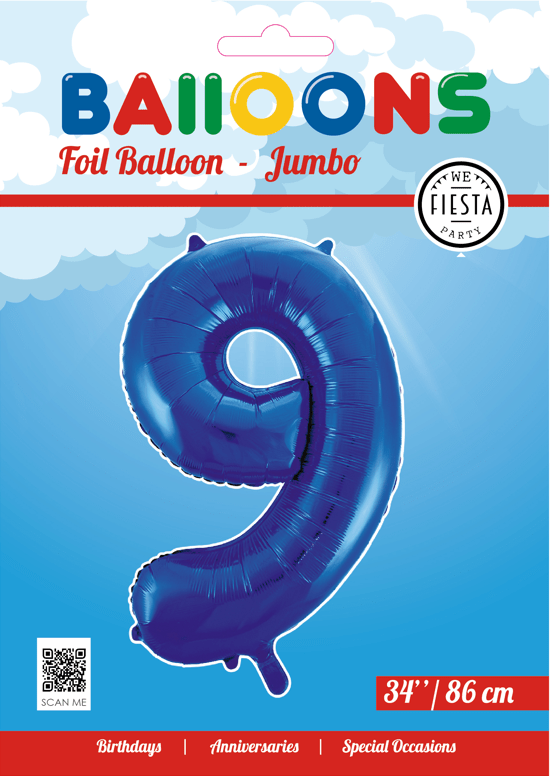 Folie Ballon Cijfer 9 Blauw XL 86cm leeg